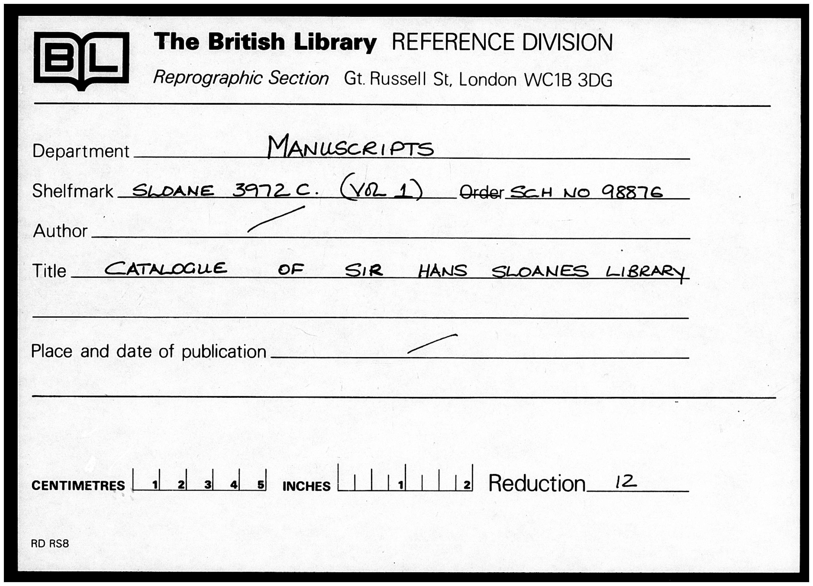 The form appears to be filled out by hand for a specific item: Volume 1 of the "Catalogue of Sir Hans Sloane's Library," which is held in the Manuscripts department under the shelfmark SLOANE 3972.C. This catalogue was